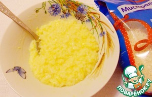 Переложить рис в миску, вмешать в теплый рис сырое куриное яйцо, половину натертого сыра, половину сливочного масла и щепотку соли.