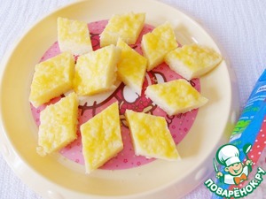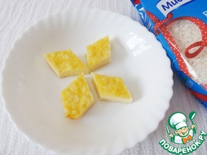 Рисовую запеканку слегка остудить, нарезать любыми фигурками (у меня ромбики).