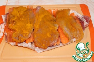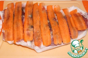 Нарезаем тонко сырую морковь, при помощи овощечистки. Выкладываем полоски на рульку.