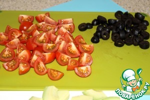 С маслин слейте рассол. Некоторые из них разрежьте пополам. В салате хорошо сочетаются со всеми продуктами и оливки и маслины, можно использовать и те и другие.