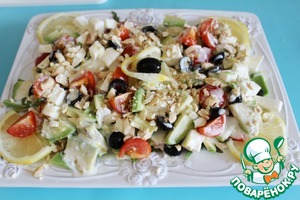 Затем полила заправкой, сверху посыпала орехами и украсила дольками лимона.