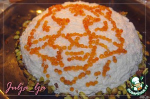 Выкладываем на салат. Точнее даже обмазываем массой салат со всех сторон. Бока посыпаем очищенными фисташками. Я их сильно не измельчала, просто слегка подавила ножом.